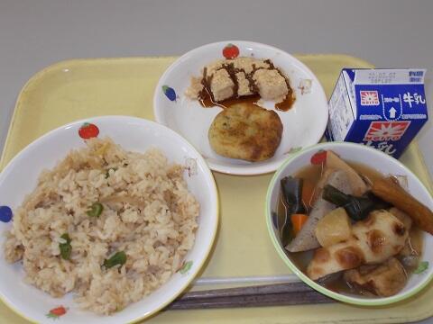 生姜の炊き込みご飯、じゃが団子、おでん、わらび餅、牛乳