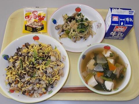 五目ちらし寿司、柚香和え、いわしのつみれ汁、節分豆、牛乳