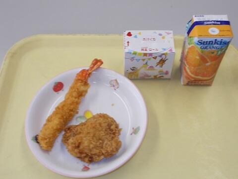 6年生には…エビフライ、一口かつ、オレンジジュース、ケーキ