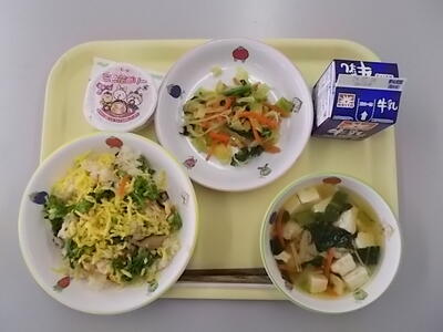 3月1日(金)献立 投稿日時 : 2024/03/01 市川小学校管理者 献立:菜の花入りちらしずし すまし汁 キャベツともやしの和えもの ひな祭り三色ゼリー 牛乳 3月3日「桃の節句」に合わせたメニューです。ちらしずしには、今が旬の千葉県の菜の花を使いました。3色ゼリーは菱餅の色で、春の訪れを表しています。春の行事を食べ物から感じてほしいです。 Tweet {{options.likeCount}} {{options.likeCount}} {{options.unlikeCount}} {{options.unlikeCount}} 0 コメント