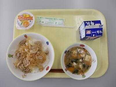 10月2日(月)献立 投稿日時 : 2023/10/02 市川小学校管理者 献立:豚丼 五目汁 オレンジゼリー 牛乳 今日の豚丼には、玉ねぎを28kgも使いました。玉ねぎには、血液をサラサラにする効果があります。また、五目汁にはたくさんの具が入っています。いろいろな種類の食べ物を食べることも健康のために大事です。 *今日の給食では、牛乳と豚肉が千葉県産です。 Tweet {{options.likeCount}} {{options.likeCount}} {{options.unlikeCount}} {{options.unlikeCount}} 0 コメント