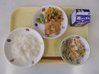 5月10日(水)献立 投稿日時 : 2023/05/10 市川小学校管理者 献立:ごはん 鶏肉のバーベキューソース焼き ABCスープ 野菜ソテー そら豆 牛乳 そら豆は、硬いさやの中に包まれています。さやは大きく、中はふわふわしています。絵本の「そらまめくんのベッド」(作:なかやみわ)」の中に出てくる『そらまめくんのベッド』が、そら豆のさやです。そら豆は、空に向かって生えるので、「空豆」というそうです。今日もよく噛んで、しっかり食べてほしいです。 Tweet {{options.likeCount}} {{options.likeCount}} {{options.unlikeCount}} {{options.unlikeCount}} 0 コメント