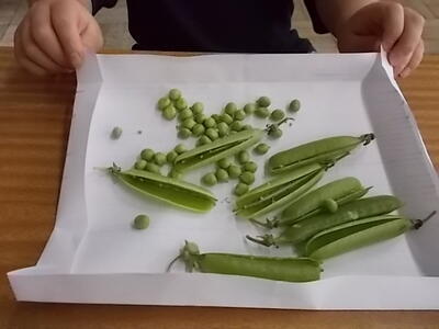 本日の給食にグリンピースごはんが出ます。3年生がそのさやむきををしました。