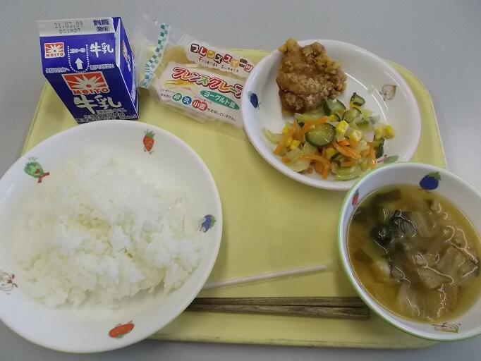 ごはん、鶏の唐揚げ、野菜サラダ、白菜スープ、クレープ、牛乳