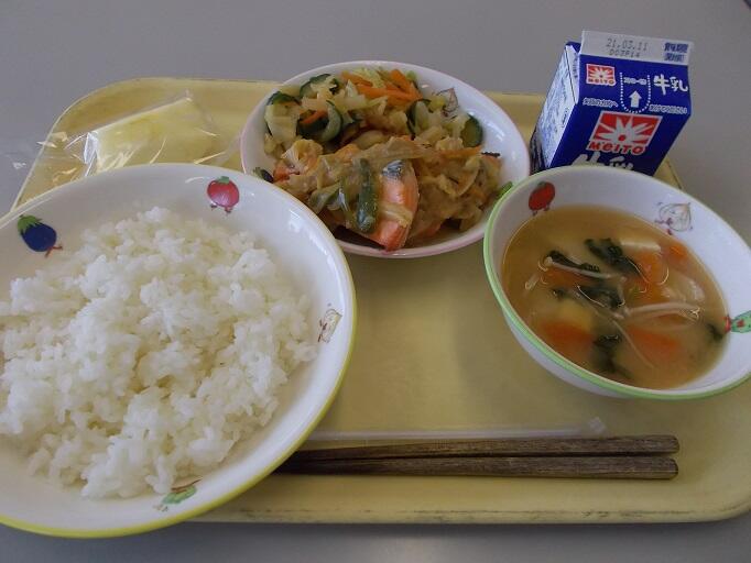 ごはん、鮭のチャンチャン焼き、和風サラダ、味噌汁、りんご、牛乳
