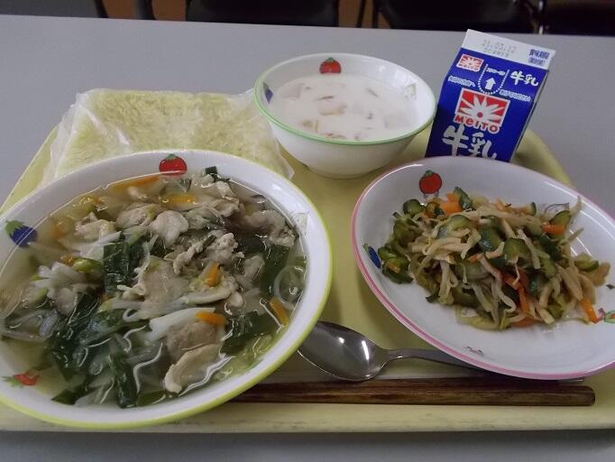タンメン、中華和え、フルーツヨーグルト、牛乳