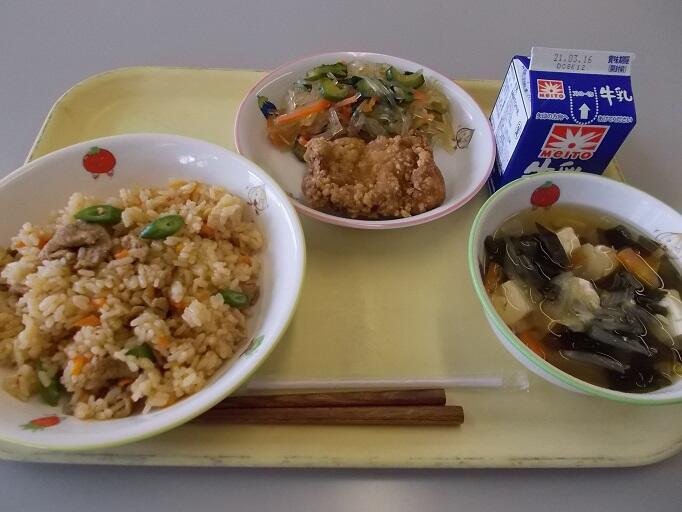 キムチご飯、鶏の竜田揚げ、春雨サラダ、わかめスープ、牛乳
