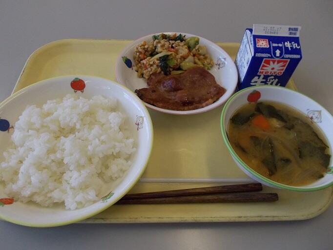 ごはん、豚肉のカルビ焼き、納豆和え、味噌汁、牛乳