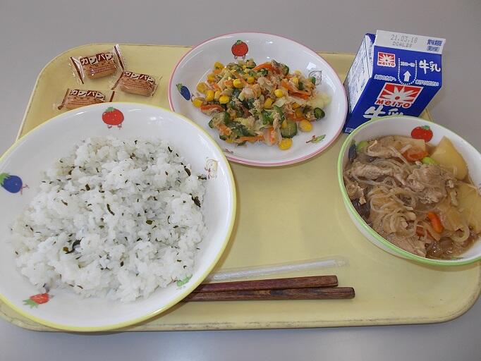 わかめごはん、肉じゃが、ツナサラダ、乾パン、牛乳