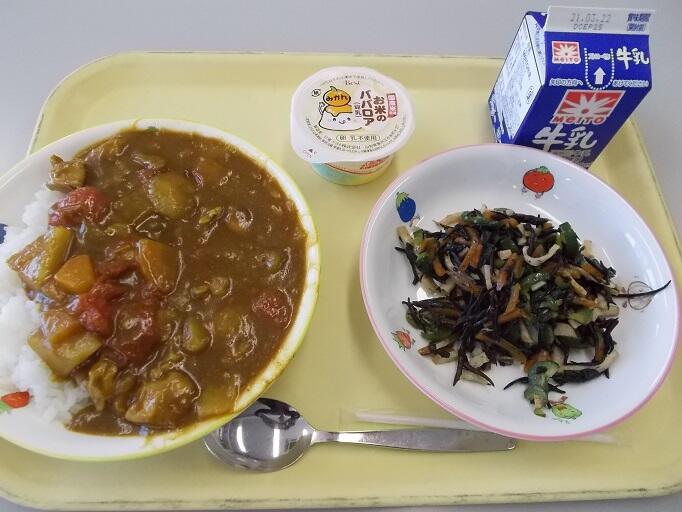 ごはん、トマトカレー、ひじきのサラダ、ババロア、牛乳