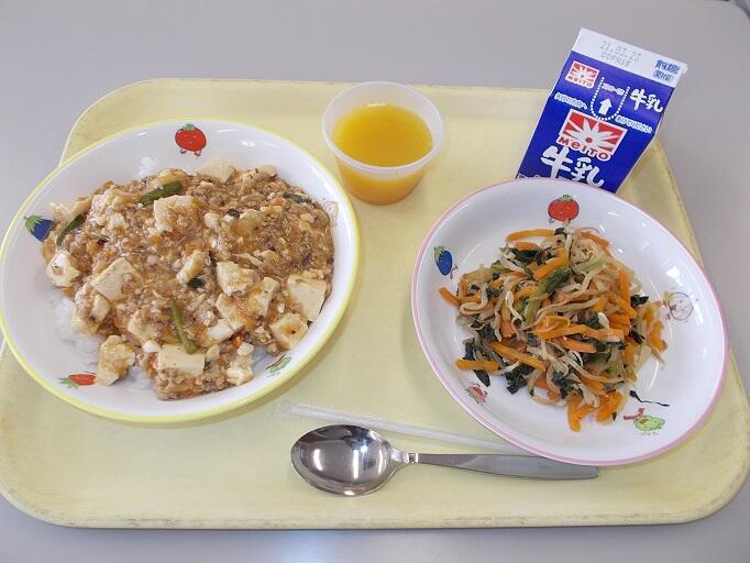 ごはん、麻婆豆腐、ナムル、オレンジゼリー、牛乳