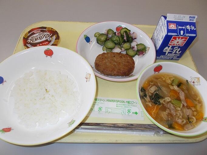 ごはん、ハンバーグ、たこきゅうり、ABCスープ、チョコプリン、牛乳