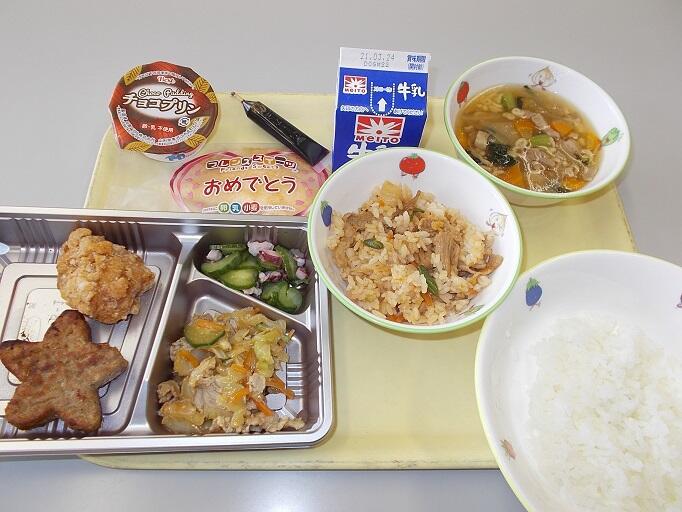 白ごはん&キムチごはん、ハンバーグ、鶏の唐揚げ、焼肉サラダ、たこきゅうり、ABCスープ、チョコプリン、クレープ、牛乳、ミルメーク