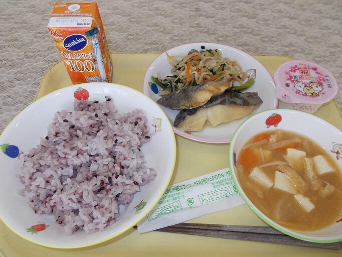 黒米ごはん、鱈の西京焼き、千草和え、味噌汁、お祝いゼリー、オレンジジュース