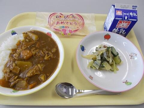 今日、1年生が小学校で初めて食べる給食なので大好きなカレーライスです。全学年が食べるので辛さは控えめ。クレープはイチゴ味ですが、「おめでとう」の文字入りは1年生だけです。