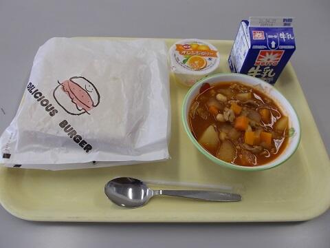 今日の主役はハンバーグ。肉だけでなく、豆腐やおからを使用しているのでカロリー低めです。サラダには海藻と野菜、味噌汁にはキノコや豆腐が入って、今日の給食だけで15品目をまかないます。バランスも味もよい給食です。