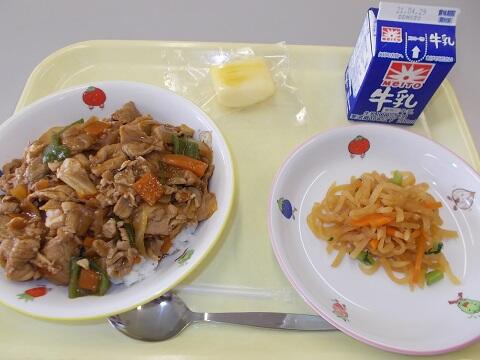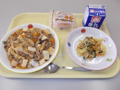 給食にホイコーローが出てきた記憶がありませんし、丼として提供されたのも初めてか、休んでいた時に出たか、いずれかでしょう。ボリュームがあります。中華サラダは、献立表にはきゅうりと人参とありますが、大根と大根葉と人参に変更です。リンゴは真空パック!1年生の早お帰りも今日までです。