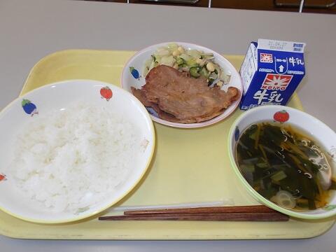 ごはん、豚肉のカルビ焼き、大豆とハムのサラダ、わかめスープ、牛乳