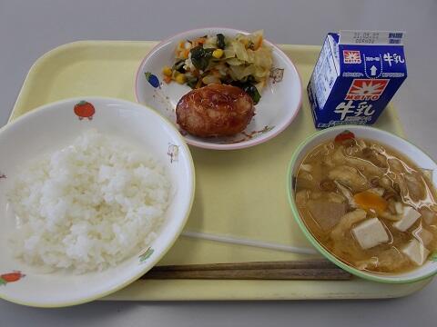 ごはん、豆腐ハンバーグ、ボイルサラダ、味噌汁、牛乳