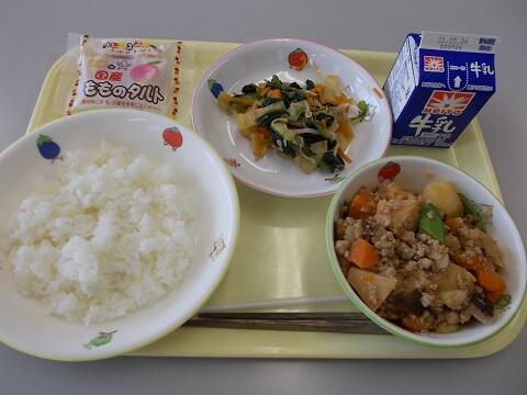 ごはん、ジャガイモのそぼろ煮、辛し和え、タルト、牛乳