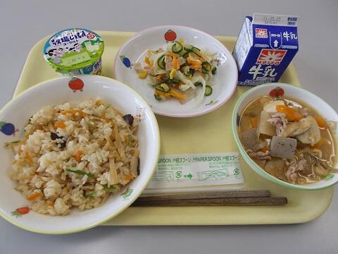 たけのこごはん、ハムサラダ、豚汁、ヨーグルト、牛乳