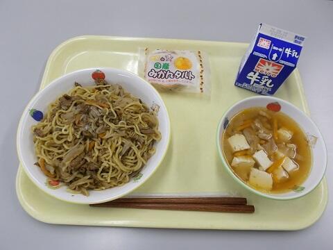 焼きそば、中華スープ、みかんタルト、牛乳