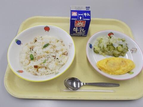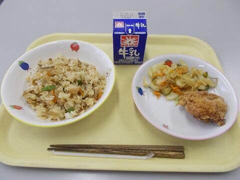 豚肉とごぼうの混ぜご飯、鶏のから揚げ、和風サラダ、牛乳