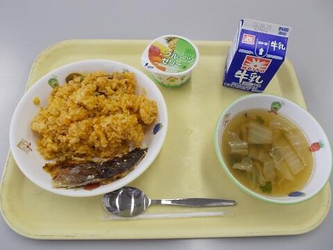チキンピラフ、鮭のマヨネーズ焼き、野菜スープ、ゼリー、牛乳