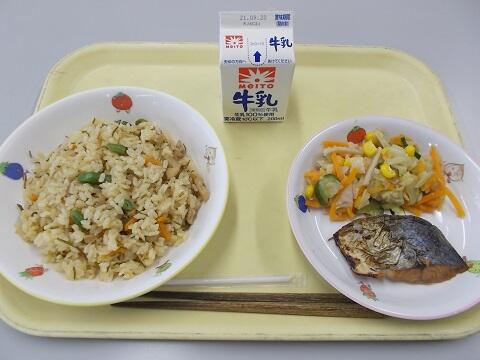 舞茸ごはん、秋鮭の塩焼き、ボイルサラダ、牛乳