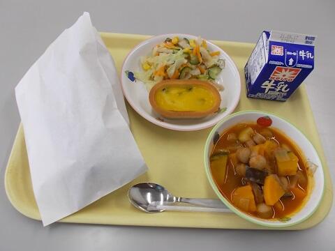 黒糖パン、カボチャグラタン、ラタトゥイユ、ハムサラダ、牛乳
