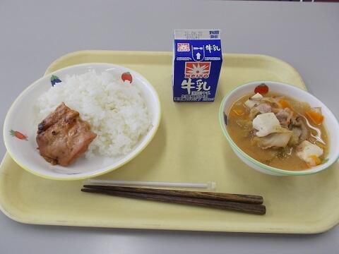 ごはん、鶏肉の味噌漬け焼き、キムチ鍋風スープ、牛乳