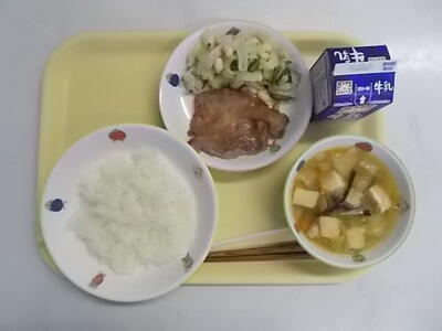 献立:ごはん 豚肉の甘辛焼き 大豆とハムのサラダ 中華スープ 牛乳