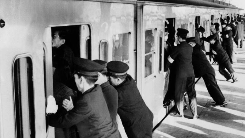 この「時差出勤」、50年以上前からあったようです。「通勤地獄」といわれた当時の国電のラッシュアワーの写真は、高度経済成長期の日本の縮図ともいえます。朝のラッシュで国電が遅れて混乱するとかけが人が出るとかあったようです。乗客の「シリ押し係」としてアルバイト学生まで動員された時代です。