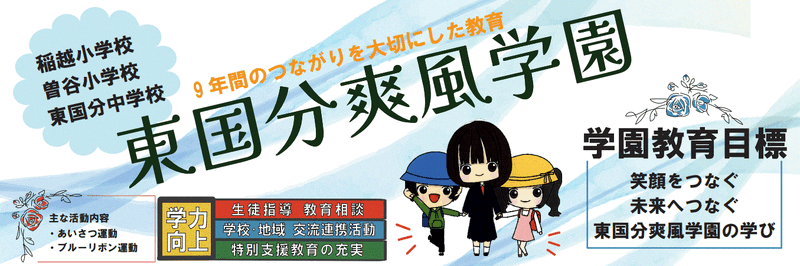 ↑ ↑ ↑ ↑ ↑ ↑ ↑ ↑ ↑ ↑ ↑ <バナーをクリックすると爽風学園のページに移動します> R7市川市非常変災時(台風、地震等)における学校等の対応について.pdf R6 グランドデザイン.pdf 東国分中学校HP 曽谷小学校HP 須和田の丘支援学校HP 国分高校HP