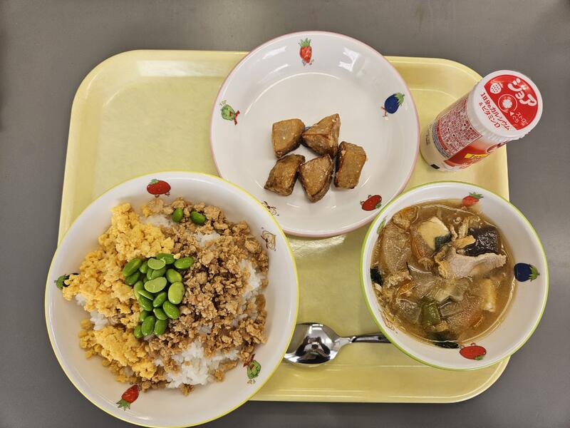 今日は、ご飯(はん)に3色(しょく)のそぼろをのせた丼です。