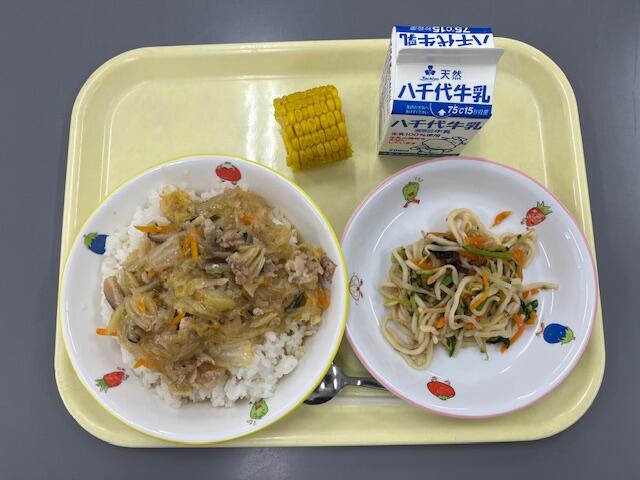 今日(きょう)の給食(きゅうしょく)のとうもろこしは、稲越小(いなごししょう)2年生(ねんせい)と支援学校(しえんがっこう)5年生(ねんせい)のみなさんが、皮(かわ)むきを手伝(てつだ)ってくれました。