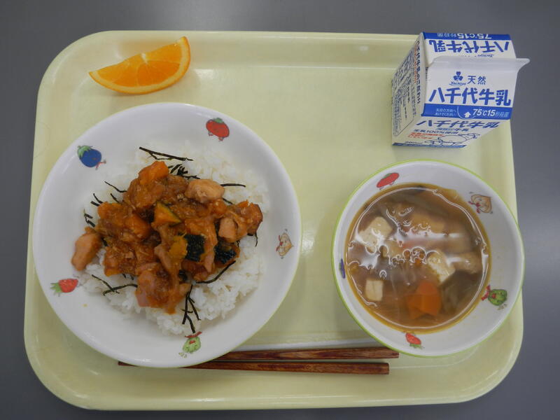 今日の汁物(しるもの)はけんちん汁(じる)です。このけんちん汁は、建長寺(けんちょうじ)というお寺(てら)で作(つく)り始(はじ)めた料理(りょうり)です。建長寺で修業(しゅぎょう)を行(おこな)っていた小坊主(こぼうず)さんは、食事(しょくじ)を作(つく)るために、お豆腐(とうふ)を運(はこ)んでいました。ですが、なんとお豆腐を落(お)としてしまい、やわらかいお豆腐は崩(くず)れてしまいました。悲(かな)しい顔(かお)をした小坊主さんの姿(すがた)を、そのお寺の和尚(おしょう)さんは見(み)て、「大丈夫(だいじょうぶ)だよ、気(き)にしないでね」と、崩(くず)れてしまったお豆腐を、汁物の中(なか)に入(い)れ、みんなで食(た)べるようにしたそうです。そんな建長寺生(う)まれの汁物は、今ではけんちん汁として食べ伝(つた)えられています。