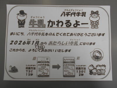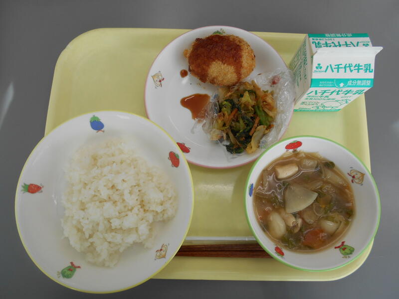 新年(しんねん)あけて初(はじ)めての給食(きゅうしょく)は、春(はる)の七草(ななくさ)のうち、すずな・すずしろ・せりの3種類(しゅるい)が入(はい)った七草汁(ななくさじる)をつくりました。
