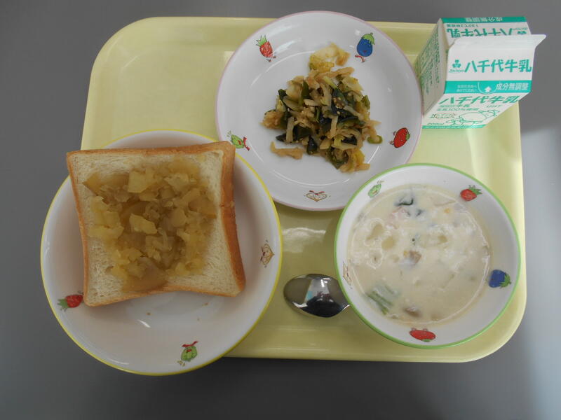 リンゴを小(ちい)さくカットし、少(すこ)しの砂糖(さとう)とレモン果汁(かじゅう)を(くわ)えて煮(に)たリンゴの甘煮(あまに)を、食(しょく)パンにのせて、オーブンで焼(や)きました。甘いリンゴの香りと、パンを焼(や)いた香(こお)ばしいかおりが、食欲(しょくよく)をそそらせてくれる料理(りょうり)です。