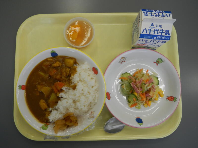 1年生最初の給食は、絵本【カレーのおうさま】のチキンカレーです。たまねぎ、にんじん、じゃがいもにお肉などなど。
