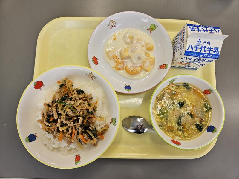 今日は韓国料理(かんこくりょうり)の「ビビンバ」です。今回は少しレシピを変(か)えて、ひき肉ではなく、豚(ぶた)の細切り肉(ほそぎりにく)を使っています。また、野菜にも、それぞれちがう下味(したあじ)をつけてみました。