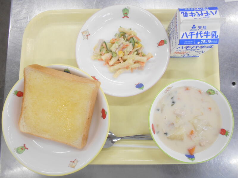 心(こころ)も体(からだ)も温(あたた)まるクリームシチューを作(つく)りました。今(いま)はスーパーにいろんなシチューの素(もと)が売(う)っていますが、給食室(きゅうしょくしつ)ではホワイトルウを手作(てづく)りし、野菜(やさい)のくずからとったスープで煮込(にこ)んでいます。ホワイトルウはグラタンにも使(つか)われますが、バターと小麦粉(こむぎこ)を弱火(よわび)でじっくり炒(いた)めて作(つく)ります。シチューの仕上(しあ)げには、ピザ用(よう)のチーズを入れてコクを出(だ)しました。