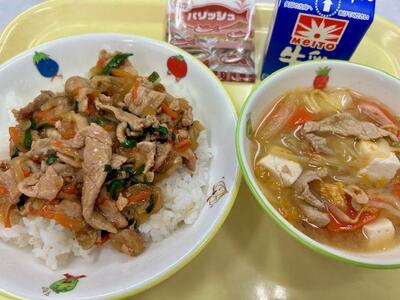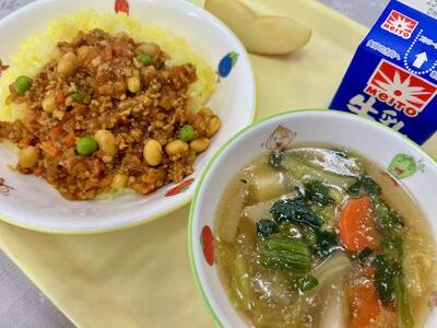 肉味噌炒め丼、五目汁、カボチャ饅頭、牛乳