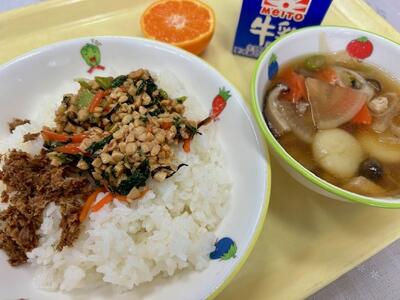 ごはん、納豆和え、エコふりかけ、ひっつみ、花みかん、牛乳