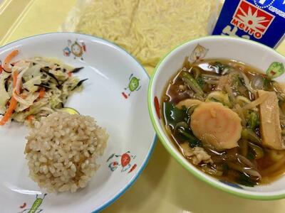 醤油ラーメン、肉団子のもち米蒸し、ひじきのマリネ、牛乳