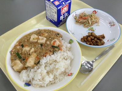 麦ごはん、牛乳、麻婆豆腐丼、バンバンジーサラダ、青のり大豆