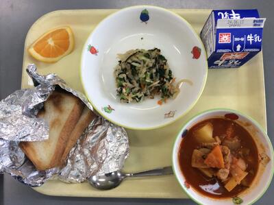 ココア揚げパン 枝豆とコーンのサラダ インド煮 河内晩柑 牛乳
