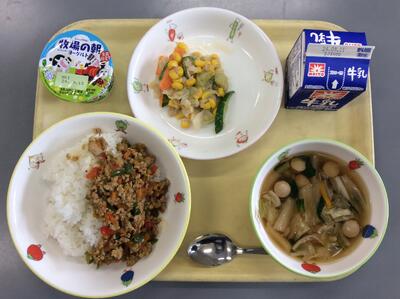 ガパオライス コーンサラダ 白菜とウインナーのスープ ヨーグルト 牛乳