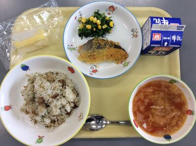 栗ご飯 鯖のごまだれ焼き ひじきの炒め煮 菊花汁 梨 牛乳