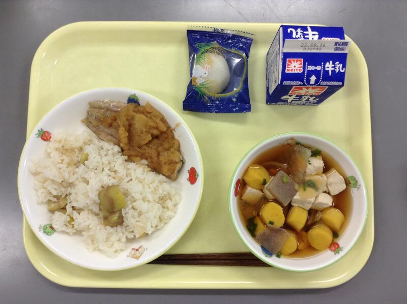 さつまいもと栗のご飯 魚のきのこあんかけ かぶと油揚げの味噌汁 りんごゼリー